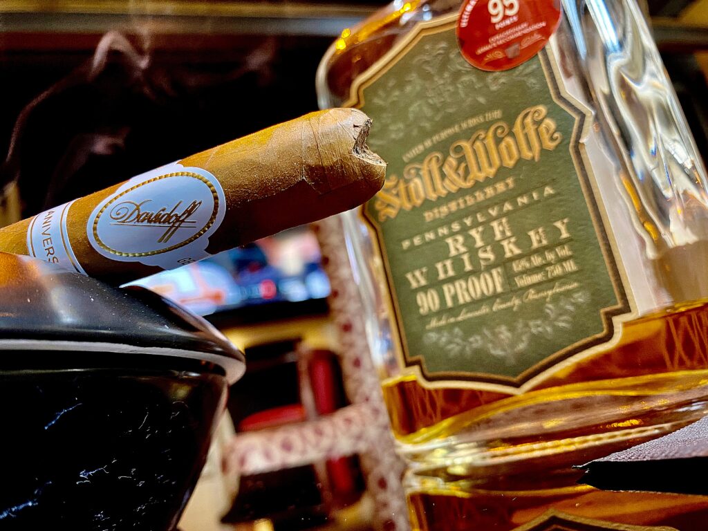 While I’m relatively new to the bourbon/whiskey scene, I do know the basics. The spirits menu has excellent variety and pricing to accommodate all needs, including tequila and wine. The menu also uses an asterisk to set aside Pennsylvania distilled whiskey and bourbons. Upon chatting more with Liz, I chose a PA brand – the Stoll & Wolfe Rye – which was, in my opinion, the perfect pairing with my Davidoff. The rye had an immediate tingle on the tip of my tongue. It had an excellent balance between sweet and heat with a very low, long, noticeable smooth finish in the upper part of my throat. The rye stayed balanced throughout the duration of the drink, and I felt like the Stoll & Wolfe brought out more flavor in my cigar. Definitely don’t be afraid to try a Pennsylvania bourbon.