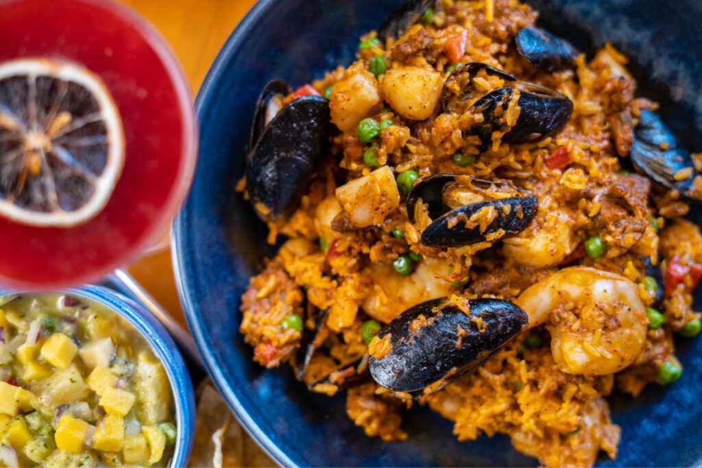 The Tropical Paella at Kaya is a flavorful, satisfying meal that that blends a variety of fresh seafood, meats, and vegetables into a single, unforgettable dish. With a generous helping of tender chicken, spicy chorizo, juicy shrimp, delicate bay scallops, and plump mussels, complemented by sweet red peppers, garden-fresh peas, and bursts of pineapple, this dish strikes a perfect balance between hearty comfort and the bright, bold flavors of the tropics. All of this goodness is nestled on a bed of fragrant saffron rice, enriched with sofrito and garlic for a warm, filling finish.
